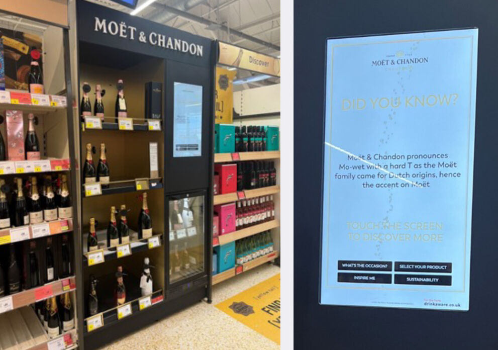 Moët & Chandon has created a digital discovery bay in-store. It secures shopper interest with a fun fact about the brand featured on screen and invites them to discover more.