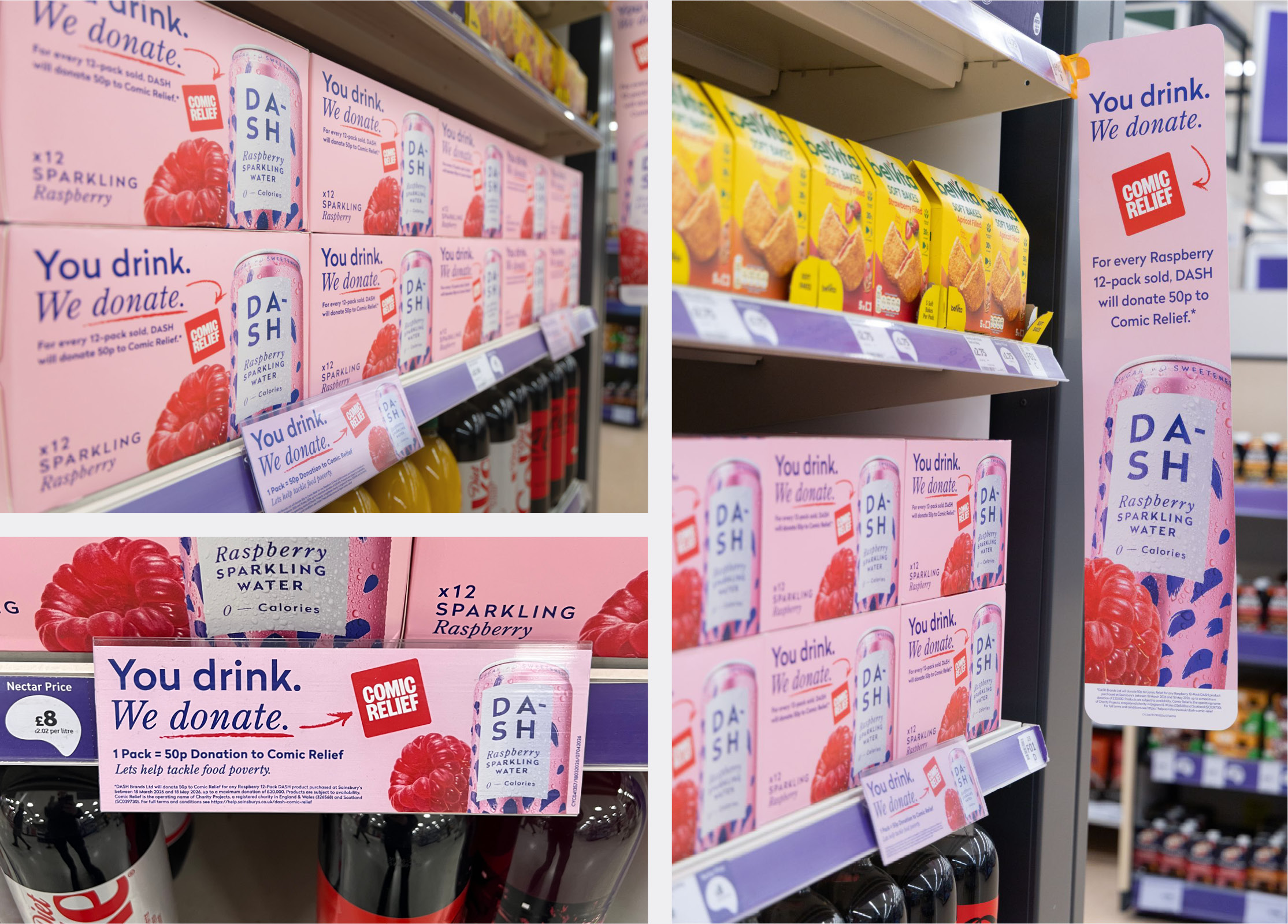 Dash Water has partnered with Sainsbury’s ‘Nourish the Nation’ programme for a high-impact Comic Relief activation. For every Raspberry 12-pack sold, Dash donates 50p to tackle UK food poverty. The pink-on-pink shelf-talkers and multipacks drive standout brand visibility while linking to a meaningful cause.