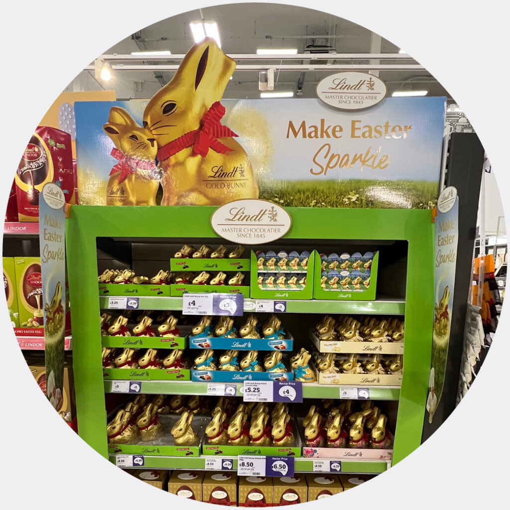 Lindt’s display delivers massive impact through a double-height header and vibrant green framing. The oversized gold foil bunny graphic and dense shelf layout create a ‘wall of gold’ that ensures aisle standout.