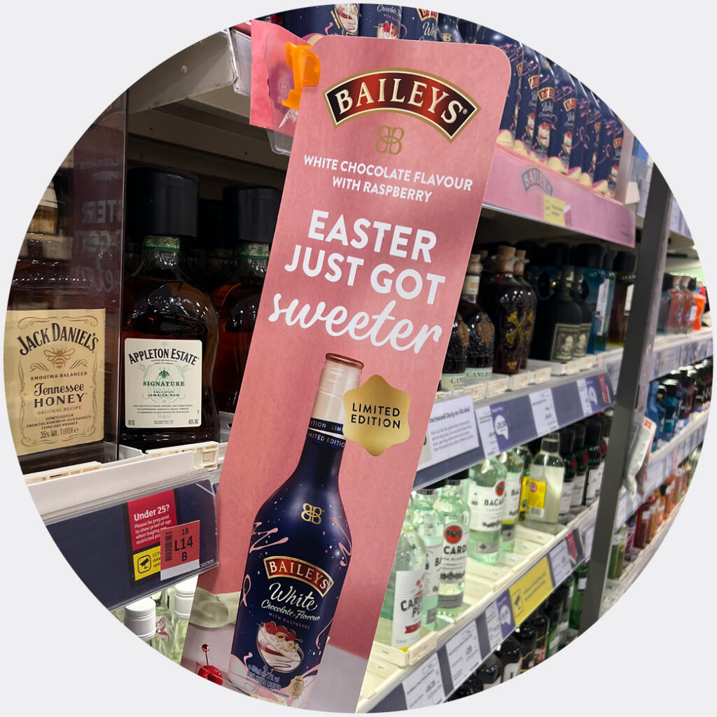 Baileys White Chocolate with Raspberry returns as a seasonal limited edition. The vibrant pink POS uses an ‘Easter just got sweeter’ hook to position the liquid as a dessert alternative or premium seasonal gift.