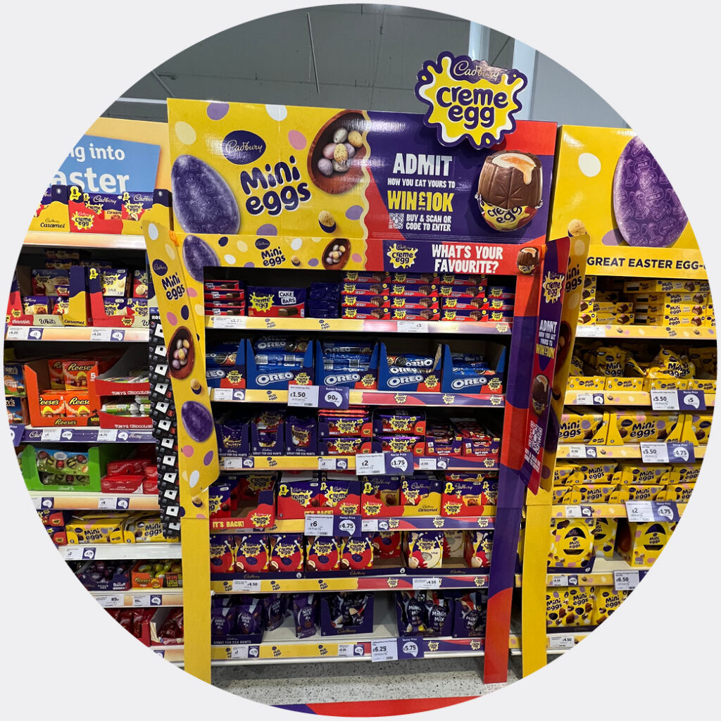 This Cadbury joint bay maximizes seasonal impact by pairing Mini Eggs with the ‘Admit How You Eat Yours’ Creme Egg promo. Shoppers can win £10k by scanning the QR code, turning a classic treat into a high-stakes event.