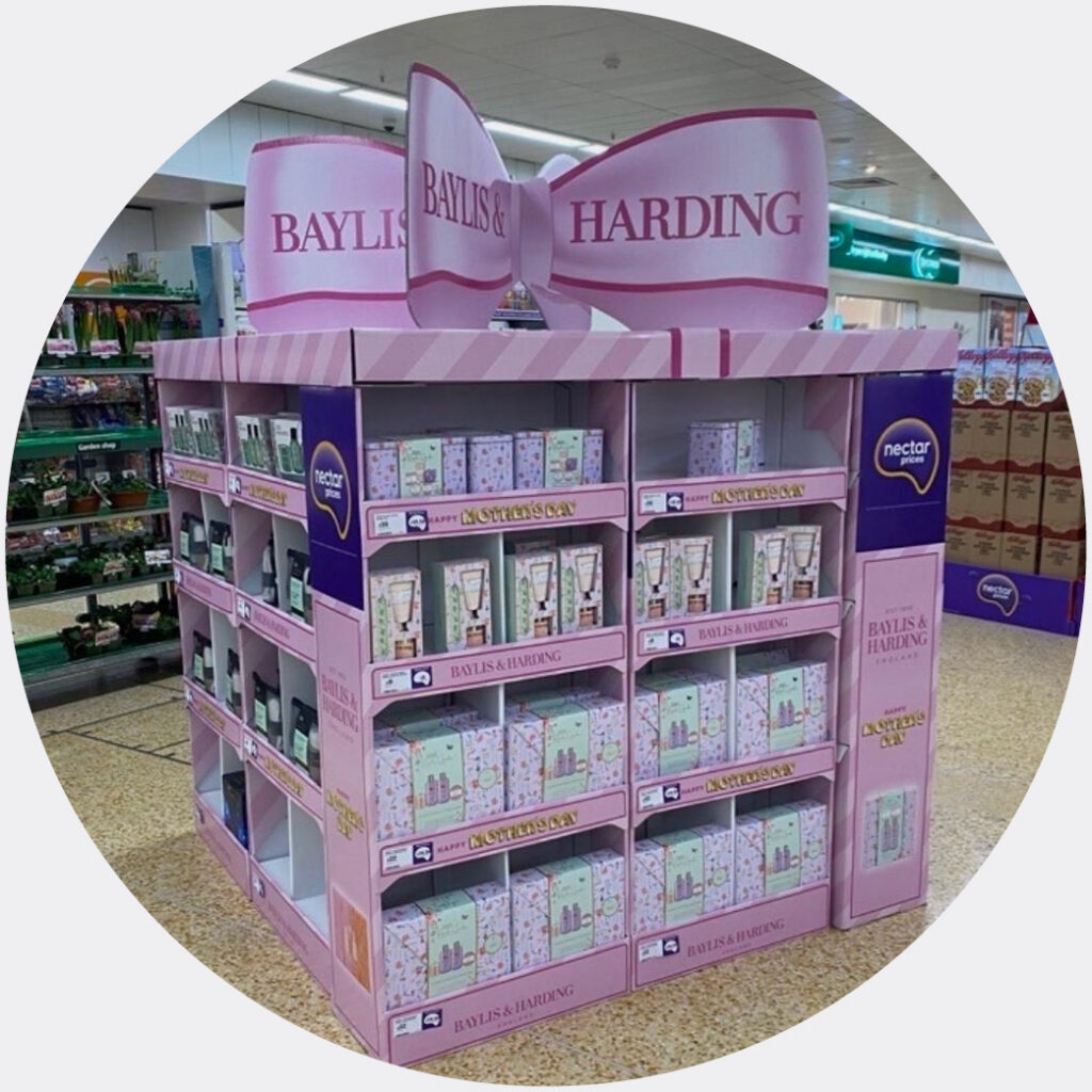 This Sainsbury’s Mother’s Day display for Baylis & Harding combines multiple FSDUs with a giant 3D bow to form a giant gift driving high-impact visibility.
